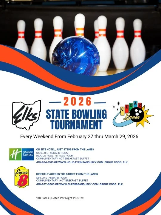 TY ALL FOR A GREAT 2025 AT KENT ELKS LODGE AND SPINS BOWL. LOOKING FORWARD TO 2026 ELKS STATE BOWLING TOURNAMENT IN SANDUSKY OHIO, BOWLING AT CEDAR LANES. GET YOUR ENTRIES IN EARLY TO MAKE SURE YOU GET THE SPOT THAT YOU WANT. TOURNAMENT WILL RUN FROM FEBRUARY 28 THRU MARCH 29. HOLIDAY INN WILL BE OUR HOST HOTEL, TRYING TO KEEP PRICE AS FAIR AS POSSIBLE. WILL LET YOU KNOW AS SOON AS WE HAVE IT IN STONE, HOTEL IS ATTACHED TO THE BOWLING CENTER AND A FINE RESTAURANT ALSO. THE ELKS IS OFFERING GREAT DINNER OPTIONS SATURDAY NIGHT: STEAK, LAKE ERIE PERCH OR LASAGNA. MENU MAY CHANGE A BIT BUT THAT IS THE PLAN NOW. RANDY HART IS THE BOWLING PROPRIETOR AT CEDAR LANES AND A VERY GOOD FRIEND OF MINE, EXCITED TO WORK WITH HIM. SARAH AND JARROD SNYDER ARE MY CONTACTS WITH THE ELKS AND ARE TRULY LOOKING FORWARD TO THE CHALLENGE AND BROTHERHOOD OF HELPING YOU HAVE AN ENJOYABLE WEEKEND WITH ENTERTAINMENT AT THE LODGE. THIS YEAR WE ARE RUNNING TOURNAMENT 5 WEEKS WITH AROUND 80 TEAMS EXPECTED AGAIN, HOPING FOR MORE, I AM AGAIN TRYING TO MAKE SURE WE HAVE A FAIR AMOUNT OF TEAMS EACH WEEKEND SO IF WE HAVE A WEEKEND WITH 4-5 TEAMS I MAY ASK YOU TO PICK ANOTHER ONE JUST SO ITS MORE FUN FOR YOU. IF YOU HAVE ANY IDEAS OR ISSUES PLEASE DON'T HESITATE TO LET ME KNOW. IF THERE IS ANYTHING I CAN DO TO MAKE YOUR WEEKEND MORE ENJOYABLE JUST LET ME KNOW.