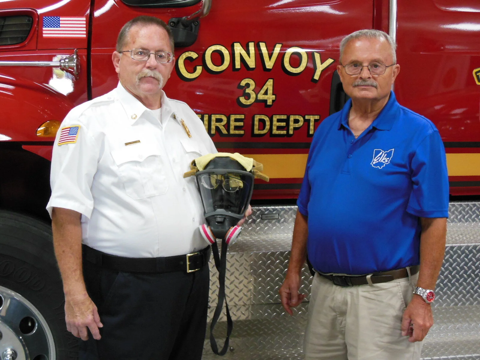 Van Wert Elks Lodge #1197 recently donated $750 to the Convoy Fire Department. The monies were used by the department to help purchase 12 G1 APR Adapters and Cartridges. The adapters can be put on the SCDA masks they are currently using for fighting fires. Once this has been done they can use the same mask to overhaul their equipment after a fire is out and not have to use an air bottle if the 02 levels are acceptable. These adapters could also be used in dusty conditions where the 02 levels are acceptable. In addition if a fire engine responds on an assist with an EMS unit into an unhealthy home environment such as the flu, covid 19 and other respiratory healthy conditions are suspected the mask can be used.