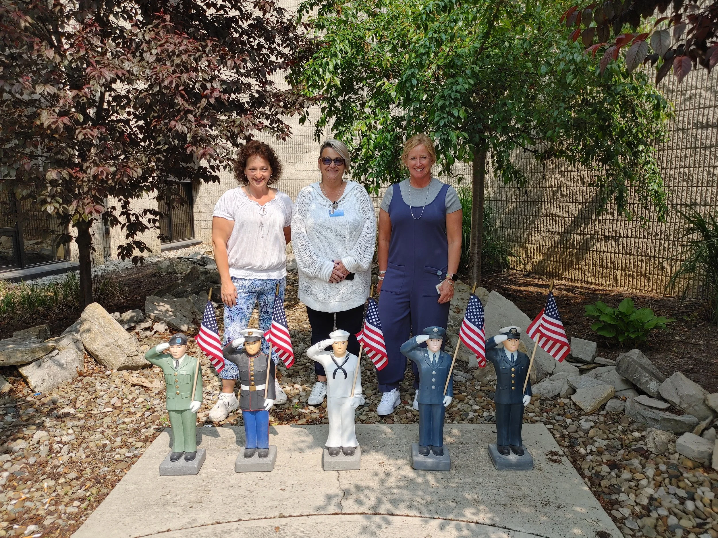 Five concrete statues each representing the branches of service were donated covering the Army, Marines, Navy, Air Force, and Coast Guard. We placed them where everyone can enjoy. The Ohio Veterans Home women are always there to help us with useful suggestions on what the veterans like, need, and enjoy.