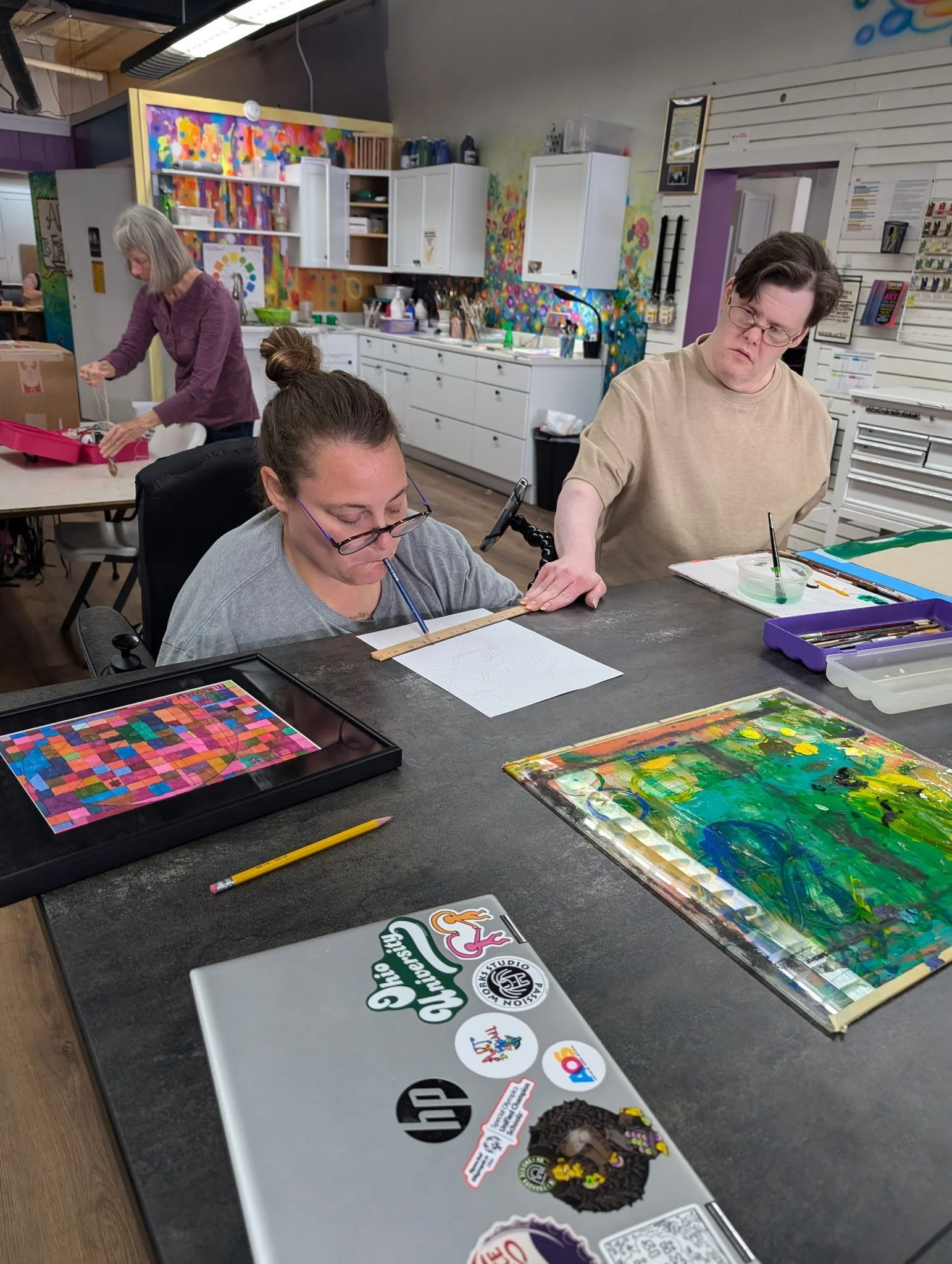 From left, Summer Braddock and Fred Wagner paint on the new handicap-accessible tables at Artists' Open Studio.