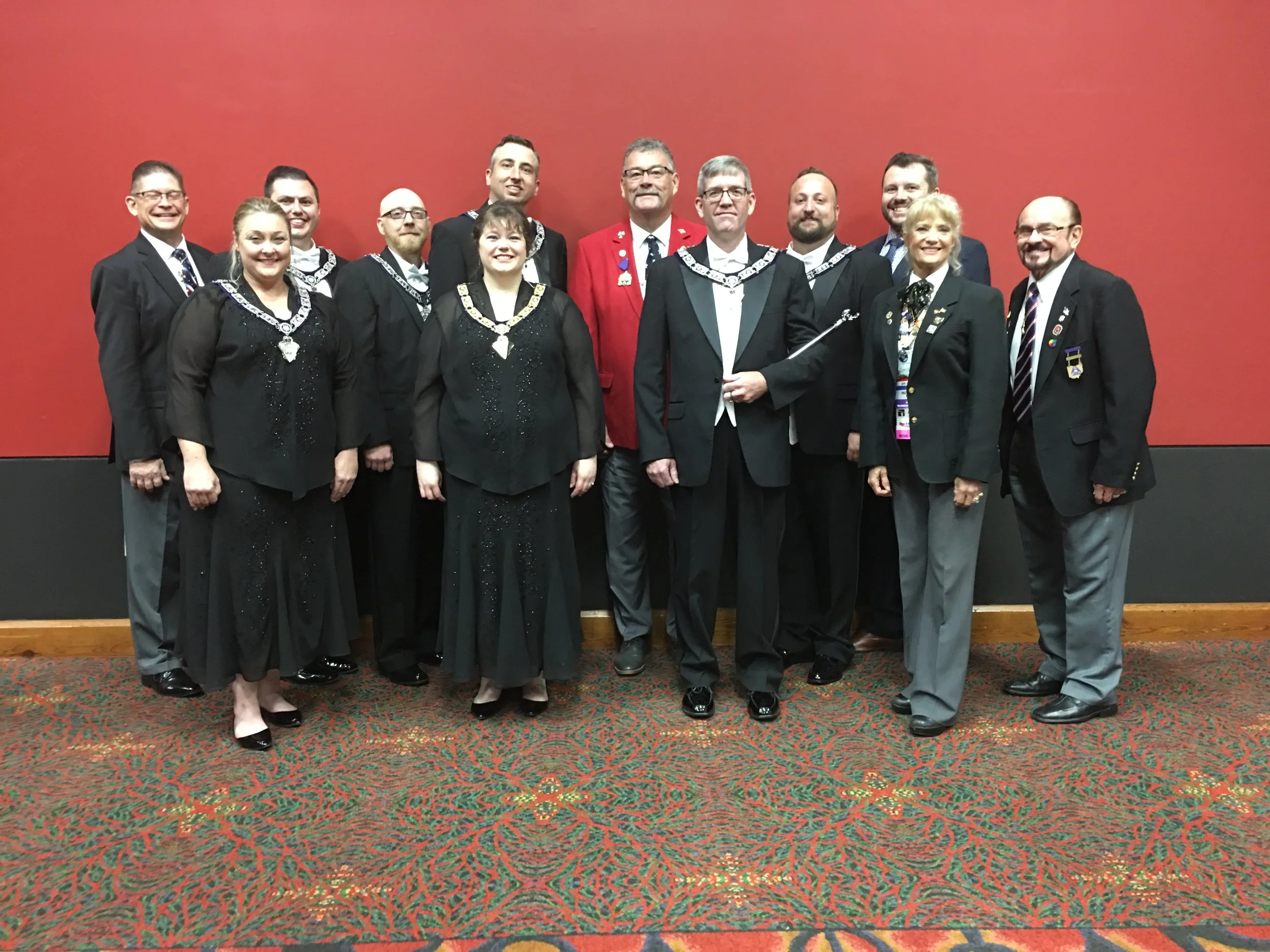 Pictured above (back row, from left): Dave Beazley (coach), Ignatius Todd Daquino (leading), Nate Davis (chaplain), Dustin McCullough (loyal), Nevin Taylor (President), Derek Kaufman (lecturing), and John Hines (candidate). Front row, from left: Gina Hoelscher (inner guard), Elisa Umbaugh (ER), Michael Sturgeon (esquire), Sue Fox Buroker (coach), and D. Jack Buroker (coach).