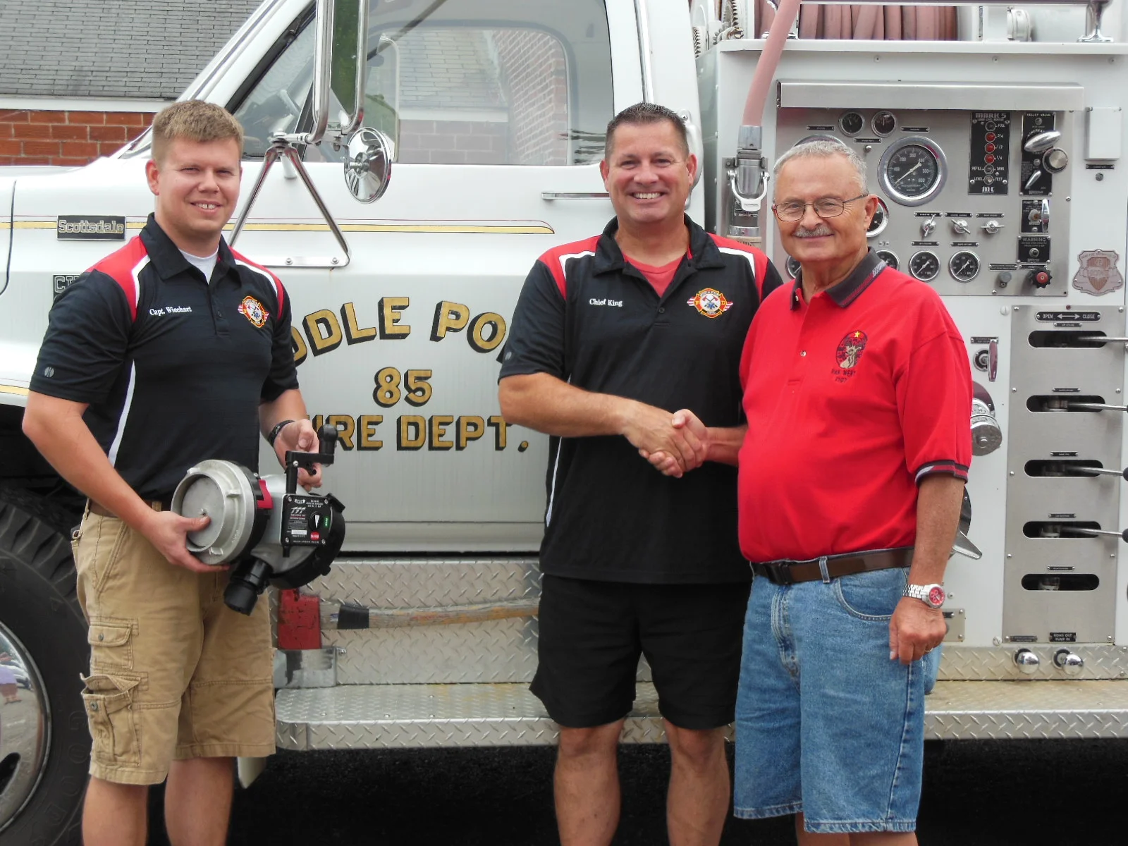 The Salem Elks Lodge #305 obtained a $750 Community Service Grant from the Ohio Elks Association upon receiving a request from the Perry Township Vol. F.D. for assistance in purchasing the quick attach monitor. This allows the hose to be hands free, while supplying a steady flow of water to a hot spot or protecting an adjacent structure during a fire. The pressure of the hose pushes the tripod structure into the ground, keeping it stationary.According to the Chief, this frees up 3 - 4 firefighters for other duties.