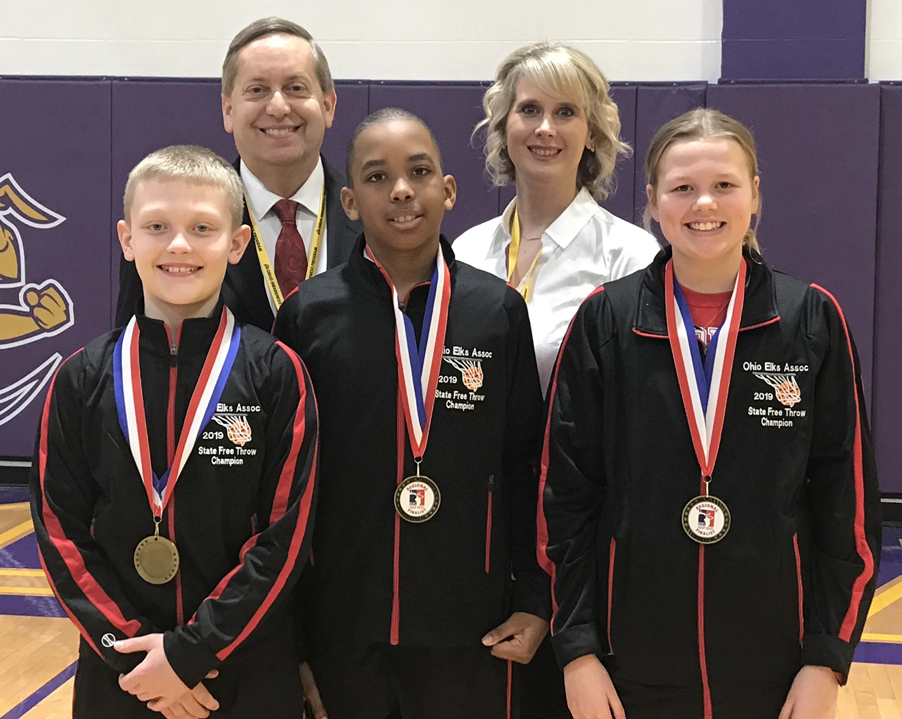 Ohio Hoop Shoot Directors Dennis and Pam Sabo pose with Ohio's three U.S. Region 4 Champions in the Hoop Shoot Free Throw Contest held in Angola, IN on March 16. From left to right are Cameron Elwer, Anthony Thompson, and Jamisyn Stinson.