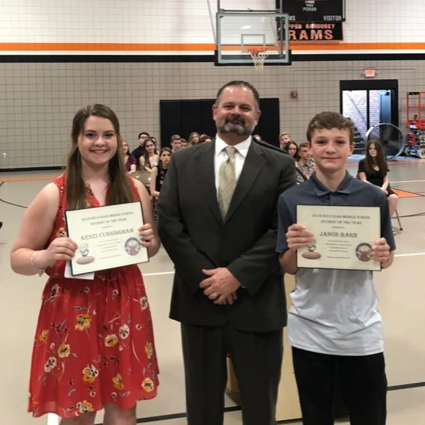 Upper Sandusky Elks Lodge #83 presented their annual Student of the Year Awards at the Upper Sandusky Middle School Honor's Program on Thursday night. Pictured presenting the awards is Elk member/teacher Bert Dible along with winners Kenzi Cunningham and Jason Barr. Each month (6) middle school students are selected as Student of the Month. They then are asked to write an essay on Leadership and School Pride and Kenzi and Jason were selected as the top students. They received a plaque and gift card for their efforts.